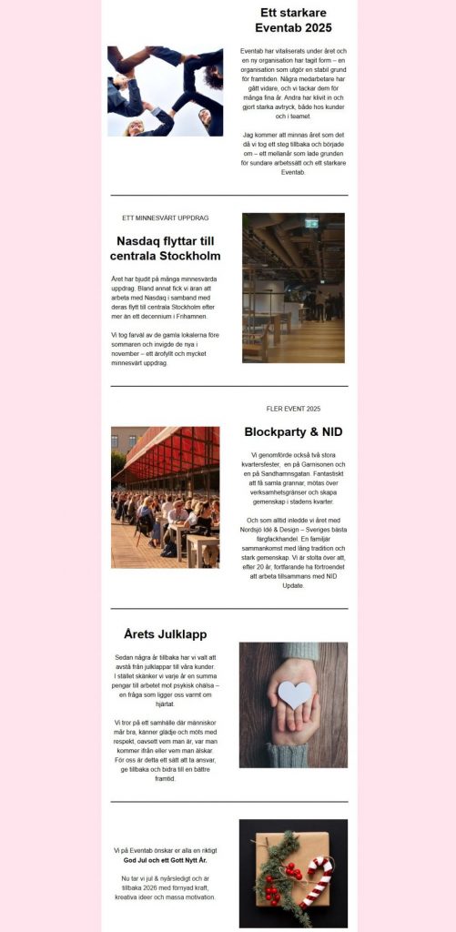 Under December 2025 skickade vi ut en krönika till alla våra prenumeranter. Där summerade vi årets utveckling och hur vi avslutat det här året. Om du vill prenumerera på kommande utskick hittar du ett formulär längst ner på vår hemsida. Vi hörs i nästa nyhetsbrev!
